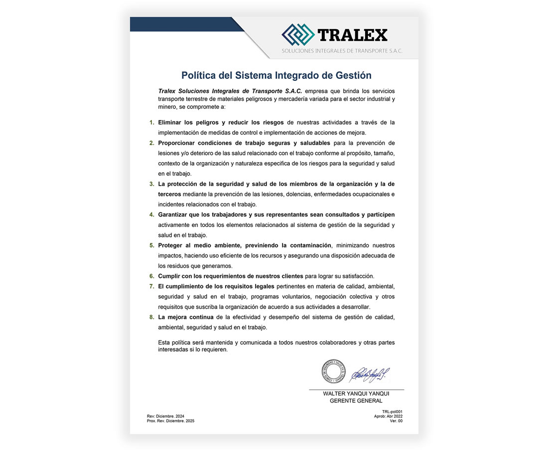 TRALEX SOLUCIONES INTEGRALES DE TRANSPORTE S.A.C empresa que brinda los servicios de transporte terrestre de carga por carretera para el sector minero e industrial a nivel nacional., se compromete a...