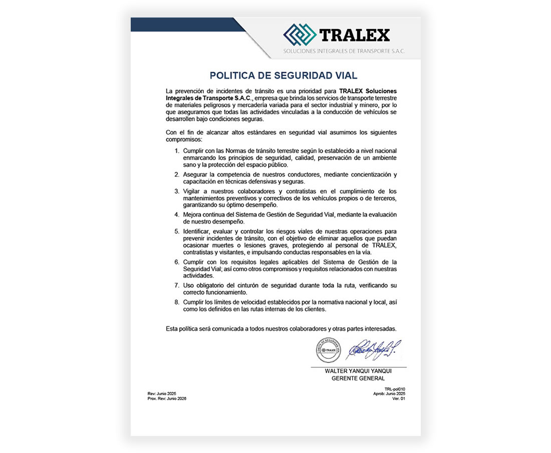 La prevención de incidentes de tránsito es una prioridad para TRALEX Soluciones Integrales de Transporte S.A.C., empresa que brinda los servicios de transporte terrestre de materiales peligrosos y mercadería variada para el sector industrial y minero, por lo que aseguramos que todas las actividades vinculadas a la conducción de vehículos se desarrollen bajo condiciones seguras.